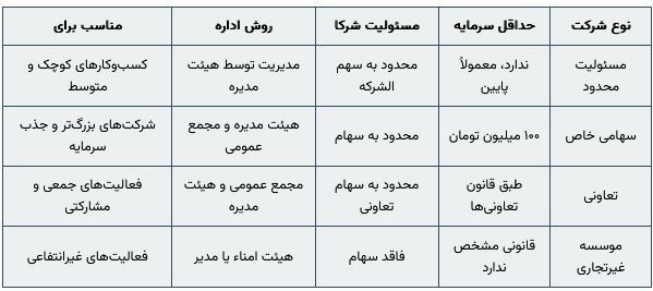 جدول مقایسه مختصر ساختارهای حقوقی اصلی