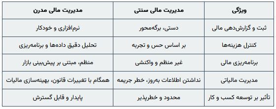 جدول مقایسه مدیریت مالی سنتی و مدیریت مالی مدرن